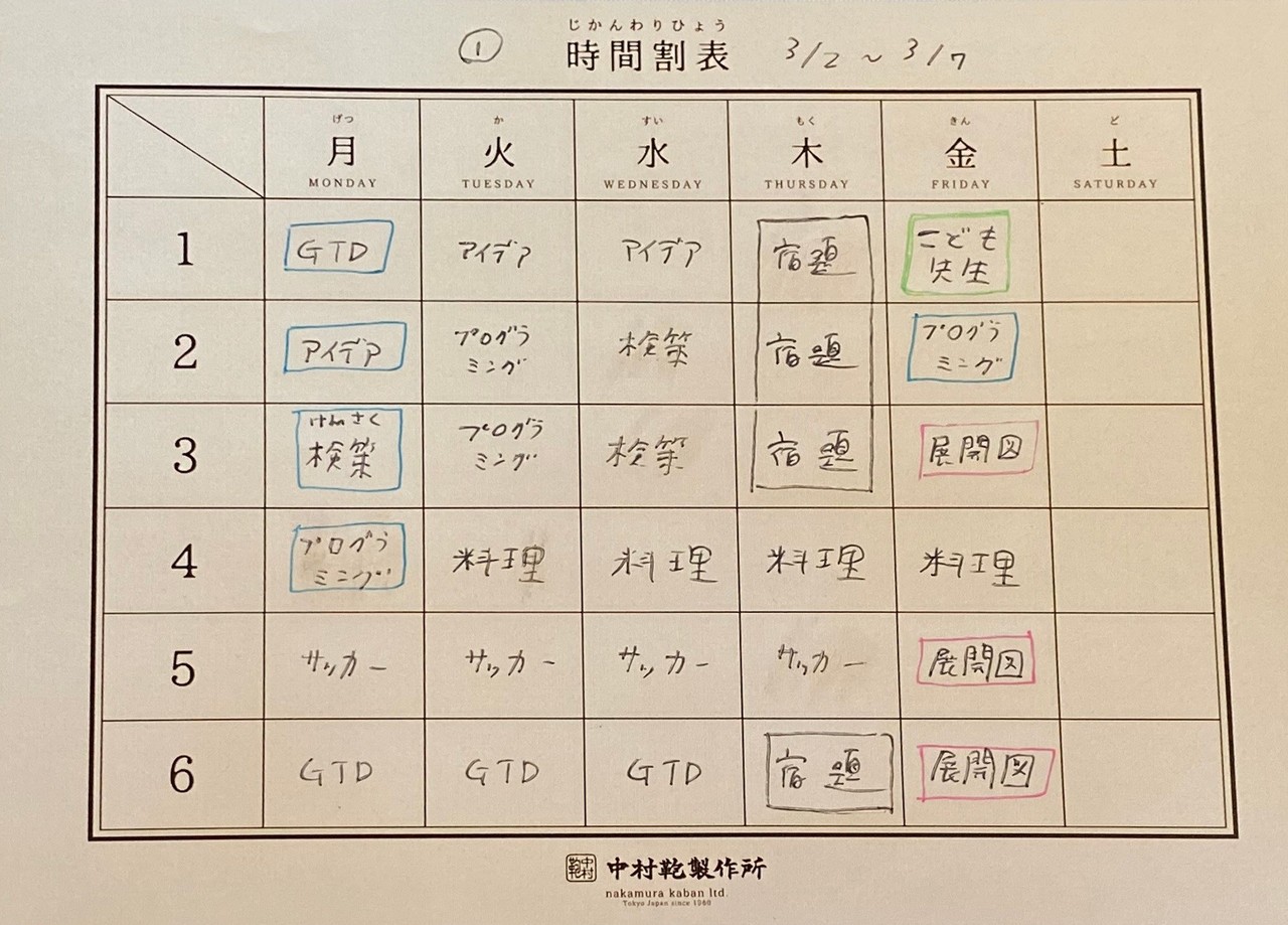 以下は実際におこなった3月の時間割です。(黒は学校タスク。水色は僕、ピンクは奥さん、緑は子どもが先生をやる時間です)