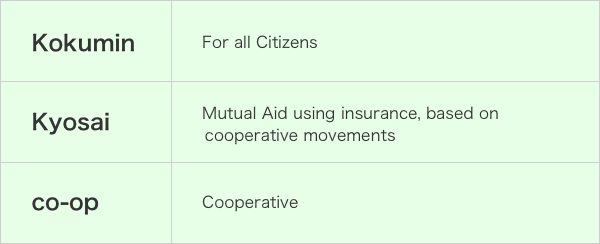Kokumin Kyosai co-op stands for the National Federation of Workers and Consumers Kyosai Cooperatives. Based on the cooperative principle, Kokumin Kyosai co-op provides insurance and mutual help for its members, under the supervision of the Ministry of Health, Labour and Welfare and the Consumers' Livelihood Co-operative Society Law. Kokumin Kyosai co-op is a not-for-profit organization, owned, managed and utilized by members who wish to protect themselves financially and improve their living standards. Founded on the "One for All and All for One" ideal of cooperatives, Kokumin Kyosai