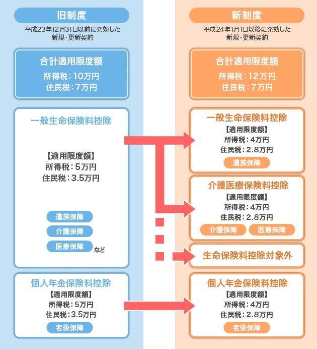 なお、平成24年1月1日以後に締結された新規契約または更新契約は 「新制度」 、平成23年12月31日以前に締結された新規契約または更新契約は 「旧制度」 (従前の生命保険料控除制度)が適用され、2つの制度が並存します。