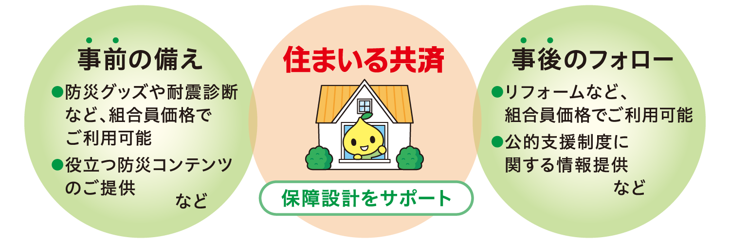 もしもに備える「共済」に加え、事前の備え・事後のフォロー、ライフイベントなど、生活をトータルにサポートするのが「こくみん Lifeサポート」です。