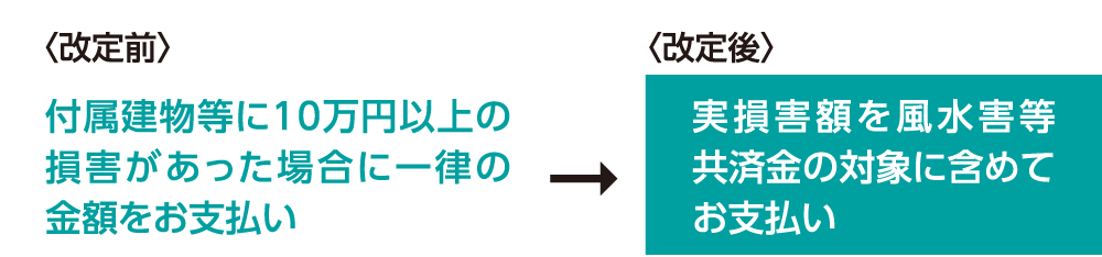 これまで、お支払いの対象外となっていた10万円以下の損害についても風水害等共済金の支払い対象となり、小規模な損害に対しても保障できるようになります。