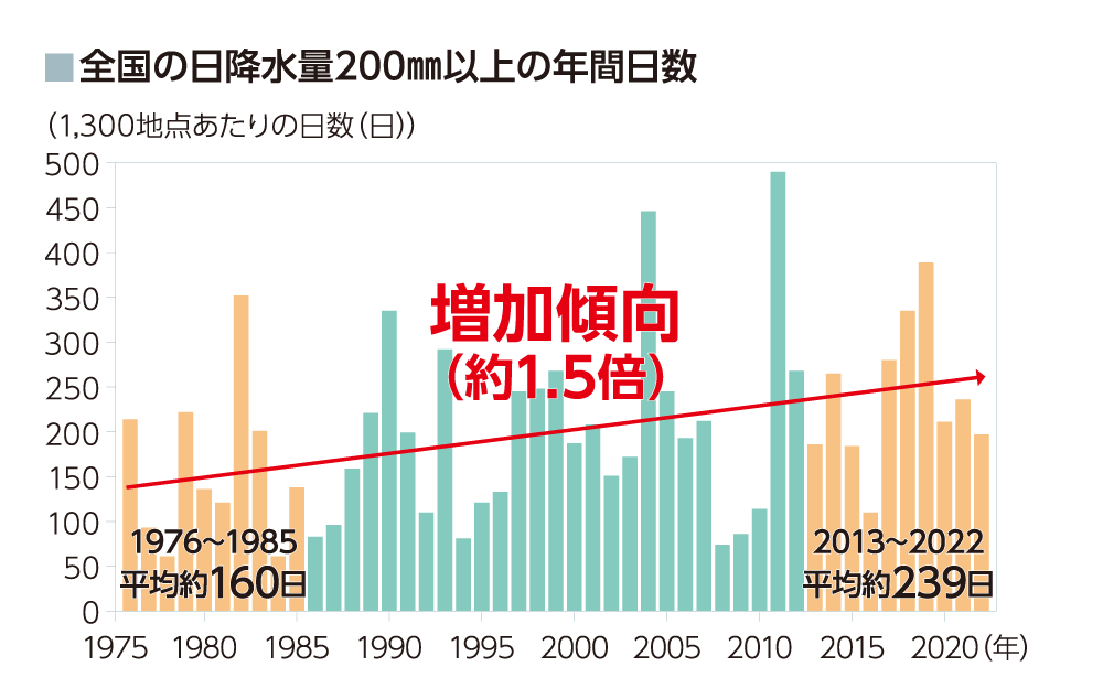 出典:気象庁「全国の日降水量200㎜以上の年間日数の経年変化(1976~2022年)」より作成
