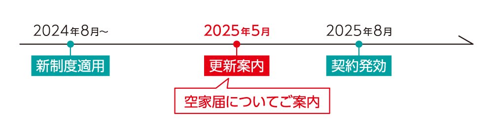 次回(2025年4月以降)の契約更新時より、当会のご案内に従い「空家届」のご提出等のお手続きをお願いします。