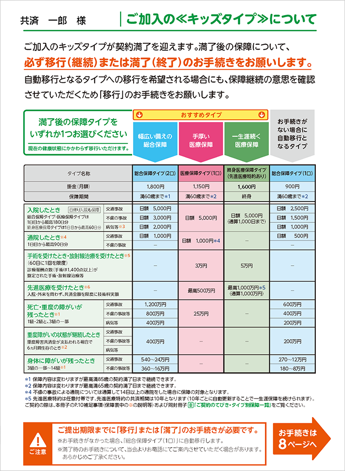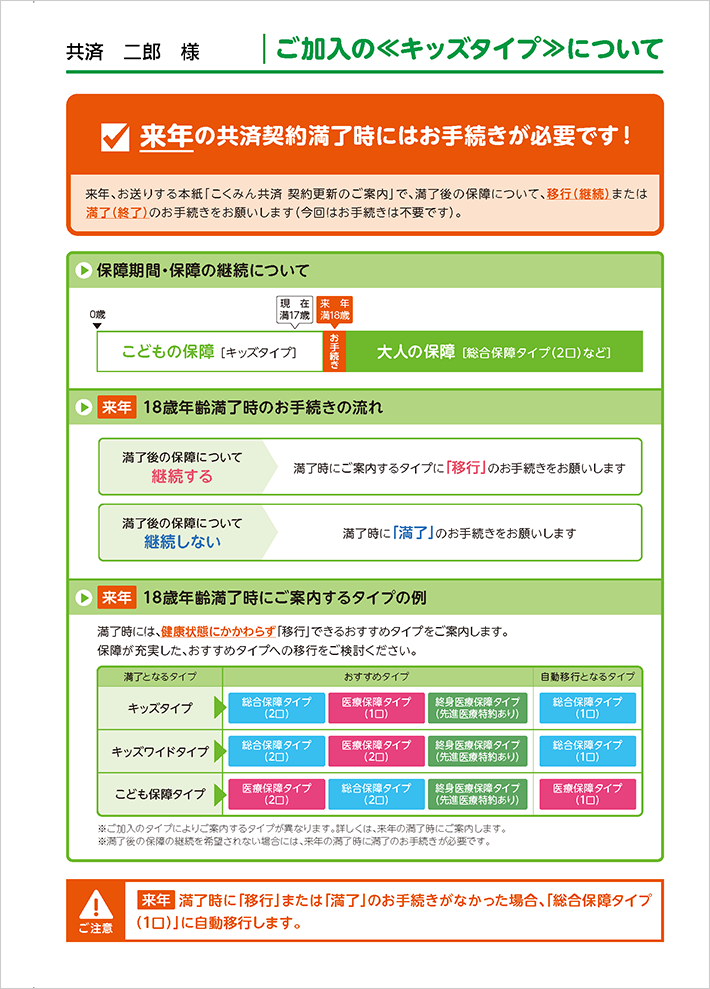 2019年8月の制度改定に伴い、満18歳の契約満了日までにお手続きがなかった場合には、「総合保障タイプ(1口)」または「医療保障タイプ(1口)」に自動的に契約を移行(自動移行)する取扱いとなります。(2020年8月更新契約分から対象)。