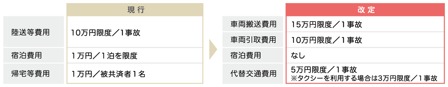 遠隔地で事故が発生した際の補償ニーズにお応えするために、現行の陸送等費用を車両搬送費用と車両引取費用に区分し補償上限を拡大します。
