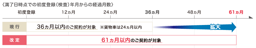 新車買替特約の付帯できる期間について、共済期間の満了日が初度登録(検査)年月から「61ヵ月以内」に緩和 します。