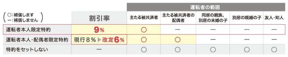 世帯構成の多様化により、ご本人しかお車を運転されないケースも多く、運転者を本人に限定した分、掛金を安くしてほしいとのご要望が多く寄せられていたため、「運転者本人限定特約」を新設します。