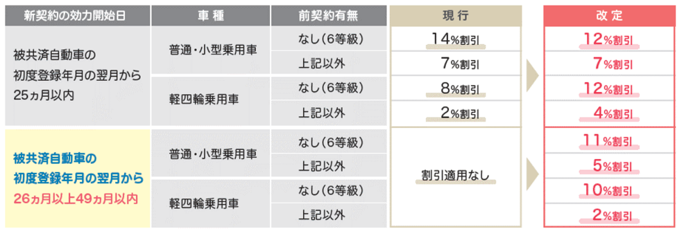 お車の使用年数の長期化がみられることから、新車割引が適用できる期間を最長3年間から最長5年間に拡大します。また、割引率の見直しを行います。