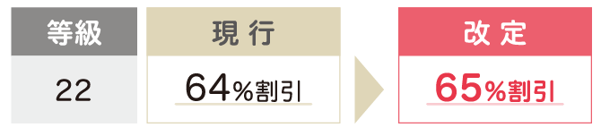 これまでの共済金のお支払い状況などを踏まえ、「無事故割引等級22等級(事故なし)」の割引率を65%割引(現行64%割引)に拡大します。