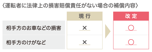 運転者年齢条件や運転者限定特約の変更手続きが漏れた場合について、被害者救済の観点から、補償対象となる期間や補償範囲を拡大します(現行の「年齢条件特約の不適用に関する特約」などは廃止とします)。
