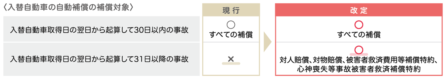 充分に被害者救済ができるように、入替自動車の取得日の翌日から起算して31日以降に契約者がお車の入替手続きを行った場合についても、賠償責任等に限って補償を拡大します。