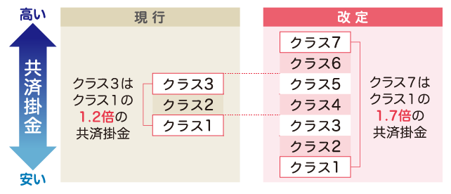 軽四輪乗用車の普及に伴う自動車ごとの安全性能の多様化などにより、型式別の事故実績にも差が見られるようになっています。型式ごとの事故実績等を適切かつ公平に共済掛金へ反映するために、軽四輪乗用車の型式別掛金クラス数を3クラスから7クラスに拡大します。