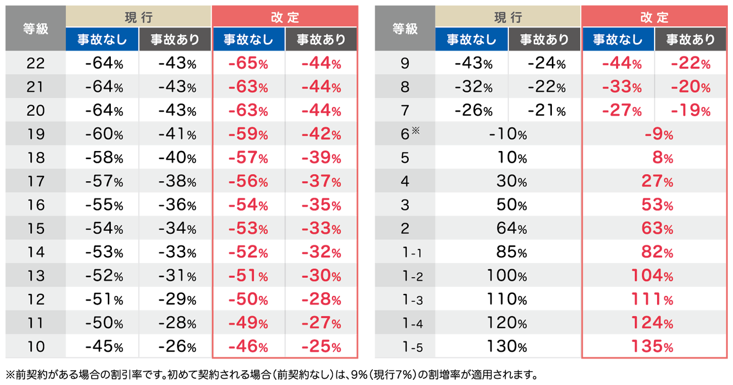 以下の通り、等級別掛金率(割引・割増率)の見直しを行います。