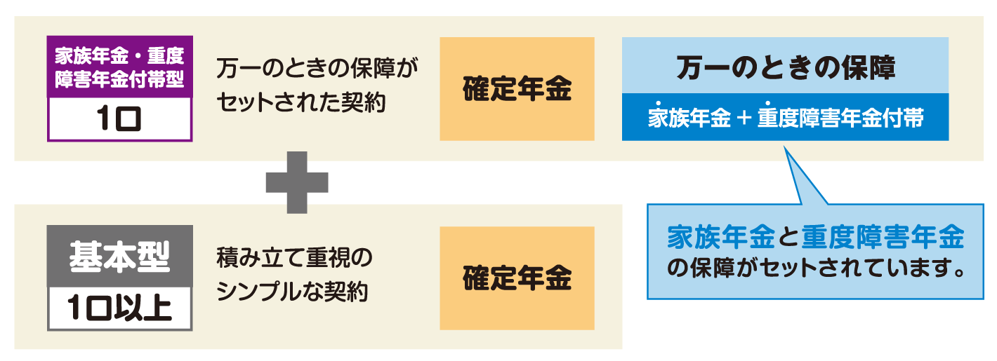 「まるごと安心プラン」は、「家族年金・重度障害年金付帯型(家重型)1口」と 「確定年金/基本型1口以上」を同時にお申し込みいただくプランです。