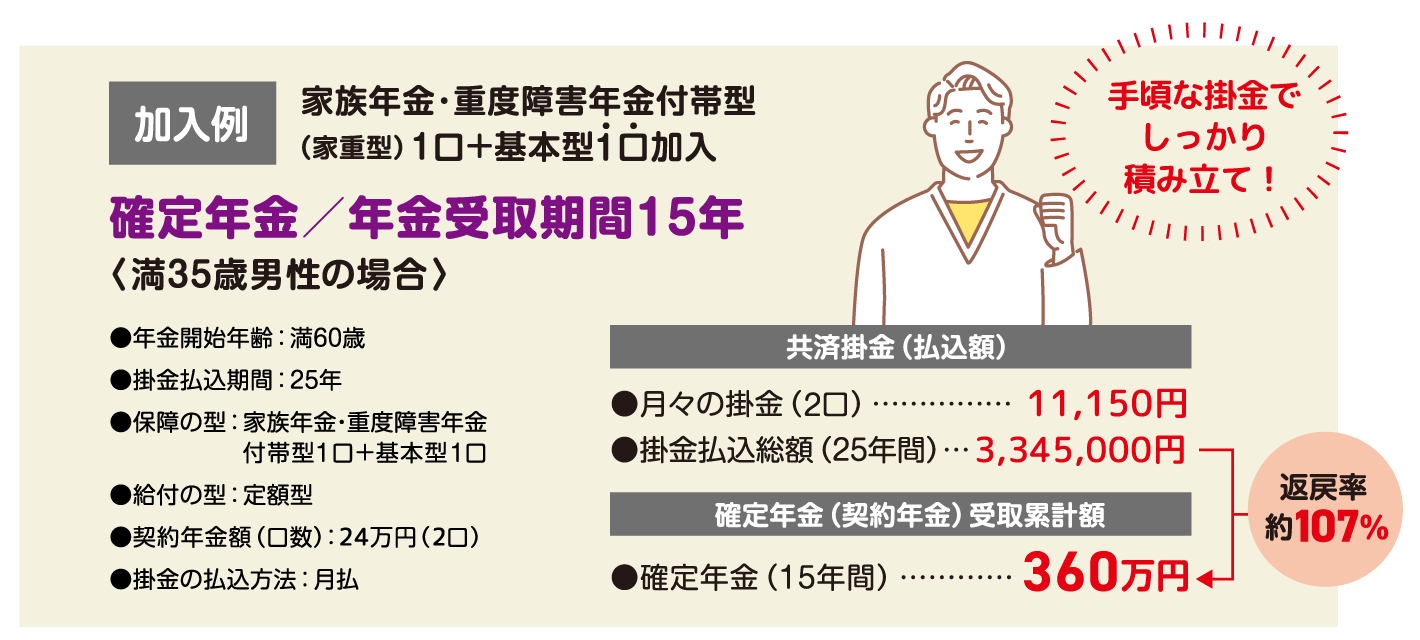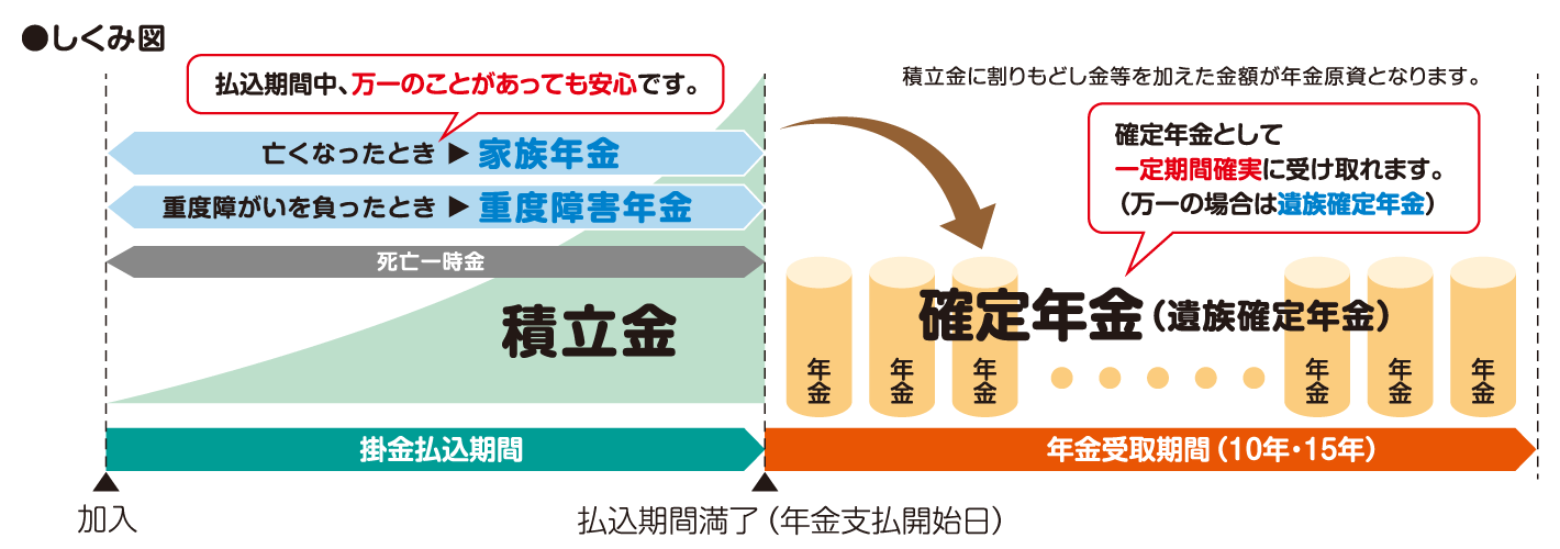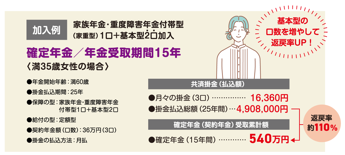 - ■契約年金年額12万円を1口として、家族年金・重度障害年金付帯型12万円(1口)・基本型12万円(1口)以上の合計24万円(2口)以上から加入いただけます。加入の限度額は既加入契約と合わせて90万円(7.5口)までです。