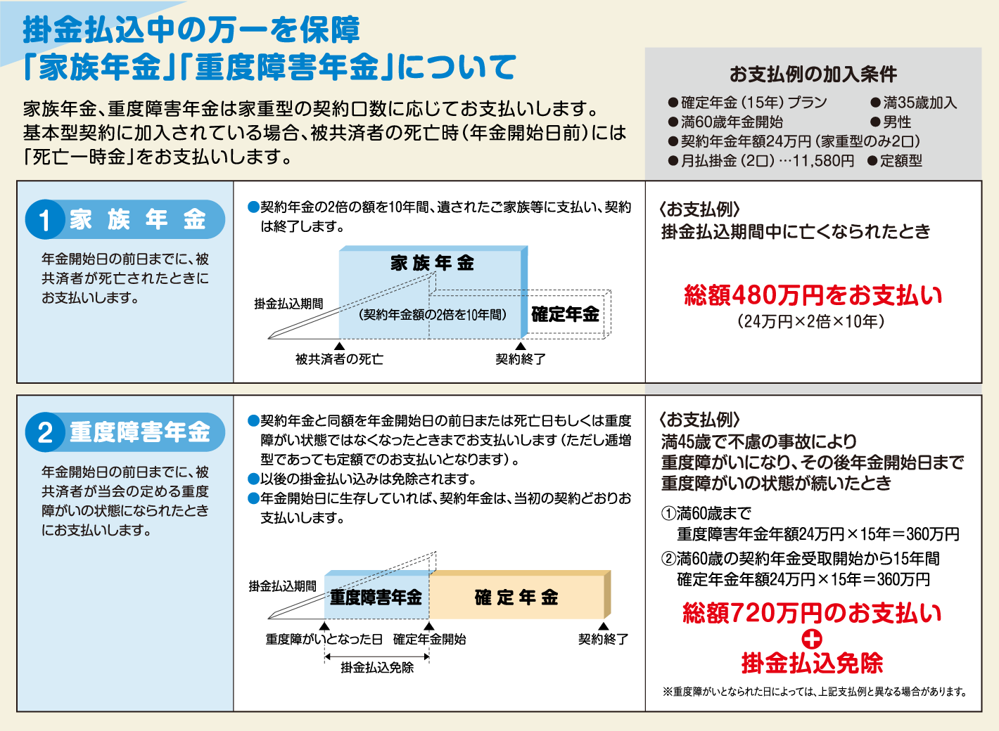 ※家重型(2口以上)のみで加入いただいた場合、保障が手厚い分、返戻率は低くなります。また、掛金払込・年金受取期間が短い場合、一部の契約で掛金払込総額が年金受取総額を上回る場合があります。