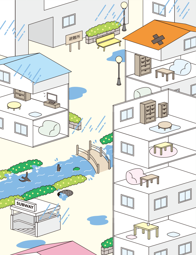 豪雨の際は「地下」には注意しましょう。過去には、ビルの地下に大量の水が流れ込み、地下鉄への浸水により交通が麻痺するなどの被害も発生しました。ビルの地下、地下街、地下駐車場など地下を活用した施設がありますが、普段は便利な施設が冠水などによって著しく危険なものになることがありますので、充分注意しましょう。