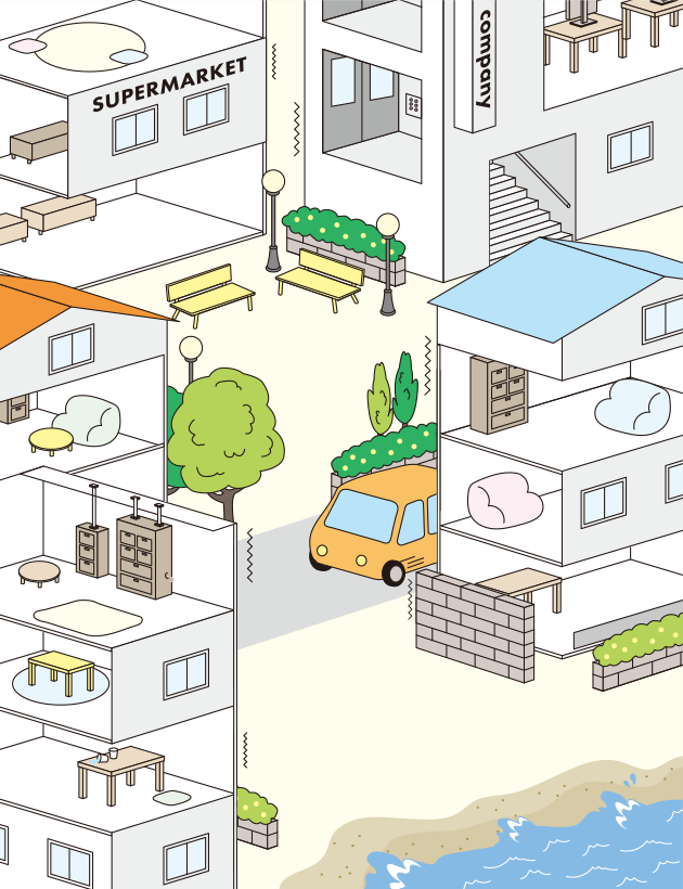 揺れを感じたら家族に声をかけ、テーブルや机の下などに隠れて身を守り、座布団やクッションなどで頭を保護します。大きな揺れの最中は思うように動けません。揺れを感じたら即座に動けるように心がけましょう。