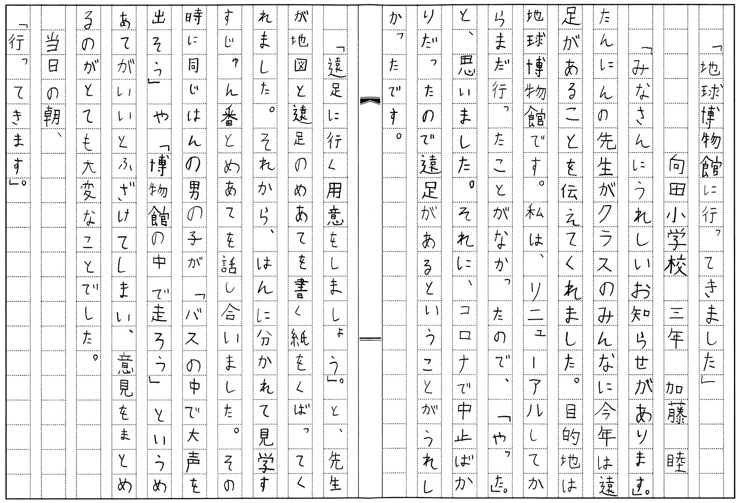 3年生 加藤 睦 「地球博物館に行ってきました」