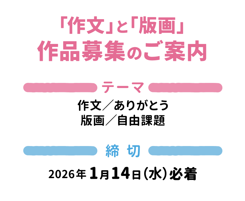 応募は、作文、版画それぞれ1人1点ずつまでとなります。