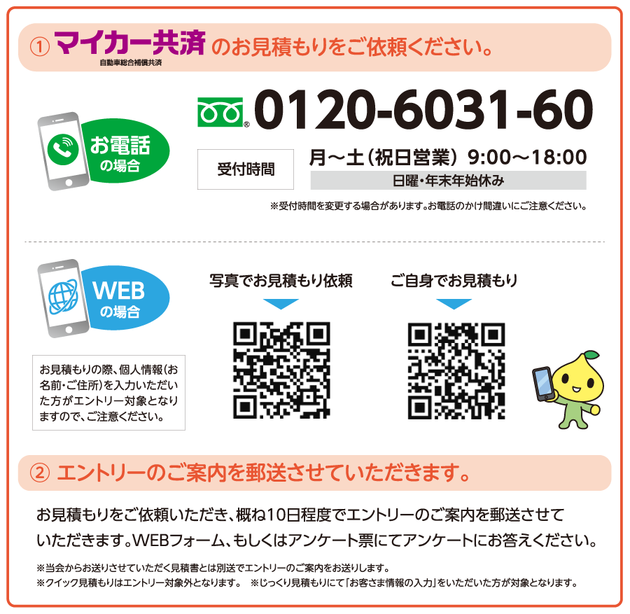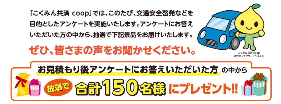 - こくみん共済 coop の共済ショップでマイカー共済加入手続きを希望する場合は、本チラシを持参いただくか、組合員であることをお申し出いただき、生協、生協組合員番号、氏名の情報が確認できる書類をお持ちください。