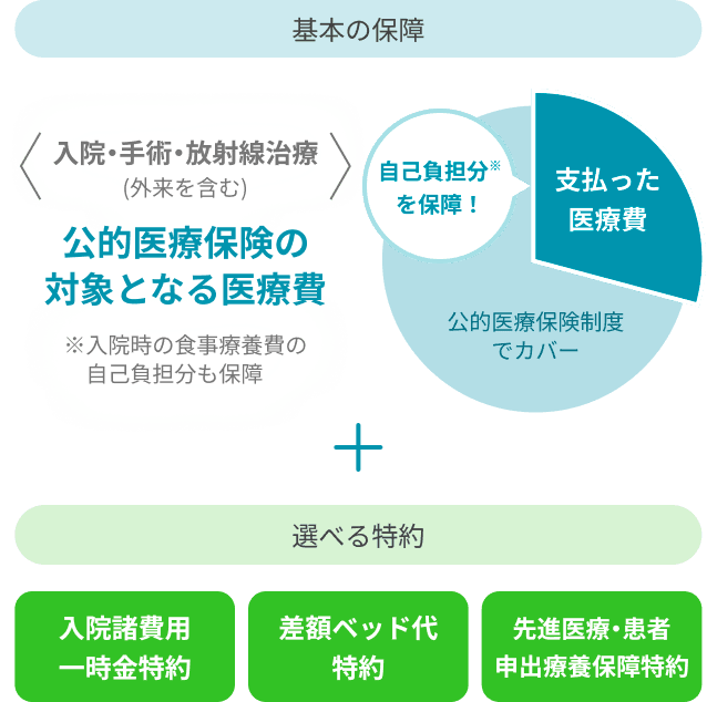 公的医療保険の対象となる入院・手術について、次の合計額をお支払いします。