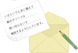 うちでは家族全員のキーホルダーに笛とミニ懐中電灯をつけています。ガソリンは半分を切ったら満タンにし、食料や水の備蓄、ヘルメット、ブルーシート、軍手、マスクなども備えています。図書館などで、防災の関連本をできるだけ読み、情報を集めるように心がけています。ふだんの生活でもそのような物資が役立つことも多いですよ。関連本は読み物としても楽しいものも出ています。
