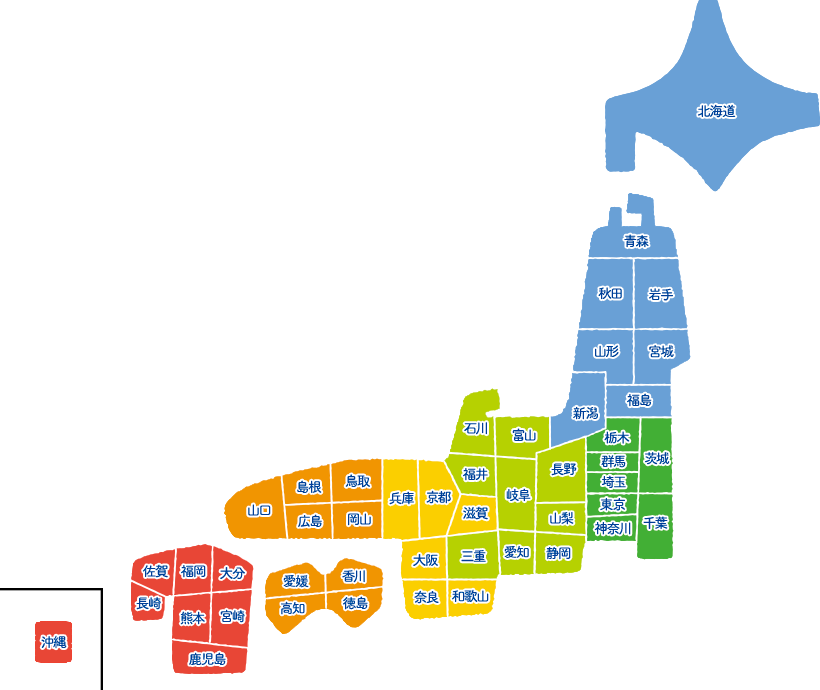 北海道 青森県 岩手県 宮城県 秋田県 山形県 福島県 新潟県 茨城県 栃木県 群馬県 埼玉県 千葉県 東京都 神奈川県 山梨県 長野県 静岡県 富山県 石川県 福井県 愛知県 岐阜県 三重県 滋賀県 奈良県 京都府 大阪府 和歌山県 兵庫県 島根県 鳥取県 岡山県 広島県 山口県 徳島県 香川県 愛媛県 高知県 福岡県 佐賀県 長崎県 熊本県 大分県 宮崎県 鹿児島県 沖縄県