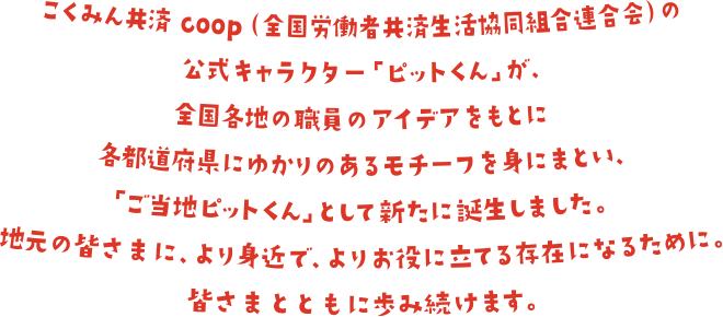 こくみん共済 coop(全国労働者共済生活協同組合連合会)の公式キャラクター「ピットくん」が、全国各地の職員のアイディアをもとに各都道府県にゆかりのあるモチーフを身にまとい、「ご当地ピットくん」として新たに誕生しました。地元の皆さまに。より身近で、よりお役に立てる存在になるために。皆さまとともに歩み続けます。