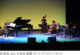 第2部では、奄美島唄の唄者である朝崎郁恵さんをゲストに迎え、吉俣良with大先生室屋ストリングスクインテットによるプレゼントライブが行われました。