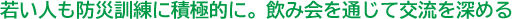 震災前は、「過去に津波が来たことはないから」と、防災訓練に参加する人は少なかったんです。しかし、震災後は、若い人も参加してくれるようになりました。私は常日頃、「自分の身は自分で守れ、自分の地域は自分で守ろう」と声をかけてきたのですが、それが浸透してきたように感じます。防災会の手伝いを申し出てくれる人も増えました。防災訓練後に飲み会を開くと、けっこう皆さん参加してくれるんですよ。やはりまだ「飲みニケーション」は有効ですね(笑)。そういった機会を積み重ね、防災組織を若い世代に引き継いでいきたいです。