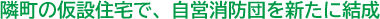 女川は壊滅的な被害を受けましたから、仮設住宅を建てるための土地が足りず、300世帯の住民が、石巻の仮設住宅に移り住んでいます。地元への愛着から、女川の団員たちが、火の用心のステッカーやチラシを配りに行くだけでも「顔を出してくれて安心した」と喜ばれます。「何かあったら、女川の消防団に来てほしい」とも言われるのですが、石巻の管轄なので、不都合もあります。例えば、消火栓は石巻のものですから、女川の消防団が勝手に使うわけにはいきません。そこで、仮設住宅に住む人たちによって、自営消防団を結成する計画を立てています。