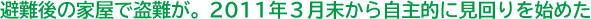 震災後、ここは、原発の30km圏内なので、一時、自衛隊も警察も撤収してしまいました。電気も届かない真っ暗な町で、自分たちの身は自分たちで守るしかなかった。だから、防犯パトロール隊を結成したんです。住民が避難した家から不審火が出たり、盗難が起こったりしていました。ガラスが割られて、パソコンや薄型テレビが盗まれている現場にも遭遇しました。