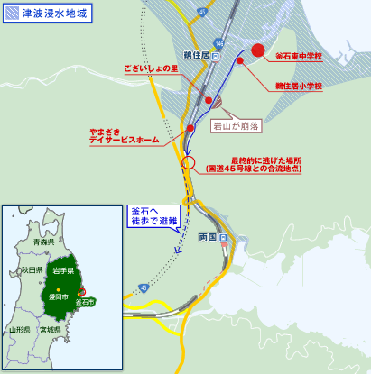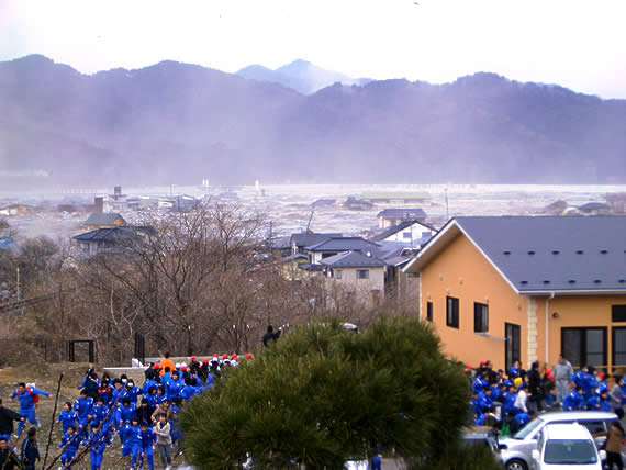 そして、釜石東中学校と隣接する鵜住居(うのすまい)小学校の生徒・児童及び教員600名以上、近隣の病院の患者、ございしょの里の入所者と職員など全部で700名以上が一斉に、やまざきデイサービスホームに逃げたのです(写真1)。
