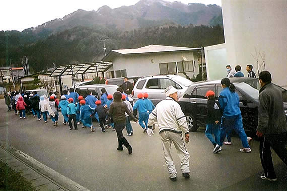 中学校単独の場合と鵜住居小学校と一緒にやる場合がありますが、色々と試行錯誤をしてきました。例えばただ避難するだけではなく、訓練の中に様々なアクシデントを盛り込んで、生徒が自分で考え判断して行動できるようにしていました。生徒には言わずに何人か抜いて、点呼時にいないようにして、どうすればいいのかを臨機応変で考えられるようにしました。また、わざとケガ人を作って、保健室に待機させました。そうしたら、普段は綱引きの綱を運んだり整備作業時に使うリヤカーを持ってきて、それに怪我人を乗せて避難しましたし、小学生や病気がちの生徒は背負って逃げました。私たち教師の予想を超える生徒の行動力には、正直いつも驚きと感動を覚えていました。