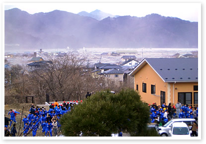 鵜住居町では死者・行方不明者約600名と言われています。ですから、おばあちゃんのいうことを聞かずに、ございしょの里に居続けたら、被害は倍近くになっていたと思います。私たちはおばあちゃんの言葉を信じたので、助かったのです。やまざきデイサービスホームに着いたら、そのおばあちゃんがいて、「いがったなあ。これで生きたぞ」と言われました。その言葉に実感がなかったのですが、建物の裏手に回って、「津波が来るのかな」と逃げてきた方角を見ていたら、ゴゴンと大きな音がして、煙が上がったのです(写真2)。「まずい、火事だ」と思ったら、北隣の大槌町との境に連なる山影を消すように、煙のような水しぶきをいくつもあげながら津波が押し寄せてきました。その波は私の目線より高かったので、「ああ、もうだめだ。これで死ぬんだな」と思ったら、今までの人生が走馬燈のように浮かんできました。