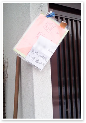 取り組んできたことはたくさんあるので、今回は代表的なものをひとつ紹介させていただきます。『安否札』配布の取り組みです。『安否札』とは、地震や津波があって避難する際、玄関先に「避難しました」の札を掲げることによって、家に入って確認しなくてもその家庭の安否の状況が分かるという札です。まずはこれを地域に1,000枚配布しました。3年間で3,000枚を配布しようと計画しておりました。実は、中学生が手渡しして歩くことで、地域の防災意識を高めようという大きなねらいもありました。今回、私の家も津波で流されたのですが、私の家より上方の流されなかった家の玄関に、避難先の書いた安否札が下げられていたのです。「生徒たちの取り組みは生きていたのだ」と、思わず涙が出ました。(写真3)