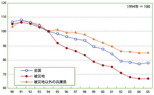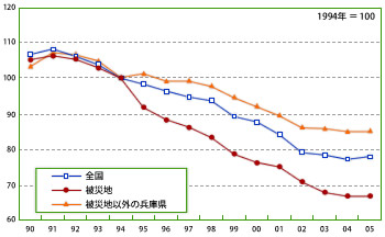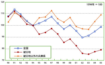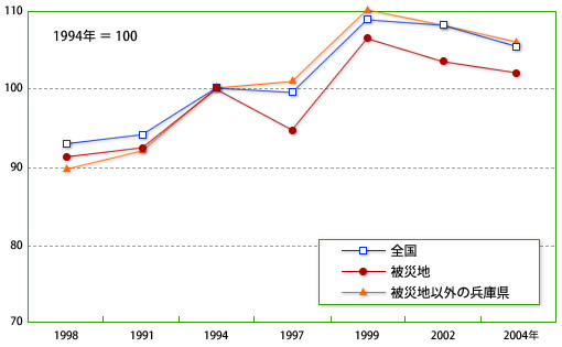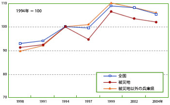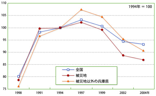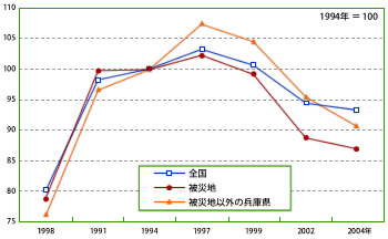 商業も、製造業と同様に、震災後には、被災地と被災地外とのギャップが生じています。小売業販売額の推移を見ると、2002年に最大6.8ポイントまで広がったギャップは、04年には4.9ポイントまで縮小しました(図3)。ところが従業員数で見てみると、02年の5.5ポイントの差が、04年には6.4ポイントと、縮まることなく続いています(図4)。特に、人口が戻っていない地域における商店街の売れ行き不振は深刻で、それに拍車をかけるかのように、工場跡地に大規模店舗が進出してきており、周辺の商店がさらに打撃を受けるというケースも見られます。