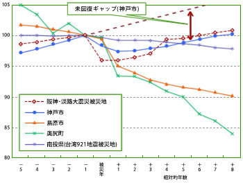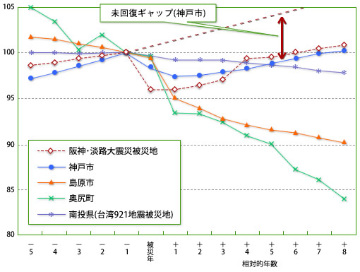 まず人口で見ると、神戸市は、2004年には震災前の水準に回復しました。一般的に、災害前に人口が減少していた地域は災害後も減り続け、増加していた地域は増え続けています。神戸市の人口は、震災前まで右肩上がりで増えていました。そこで、震災に遭わずにそのまま増え続けていた場合と震災後の増加を比較すると、増加率は同じ傾斜にはなっていますが、実際には約10万人ほどの差があります(図5)。ですから、震災がなかったら、神戸市の人口はさらに約10万人増えていた可能性があるのです。