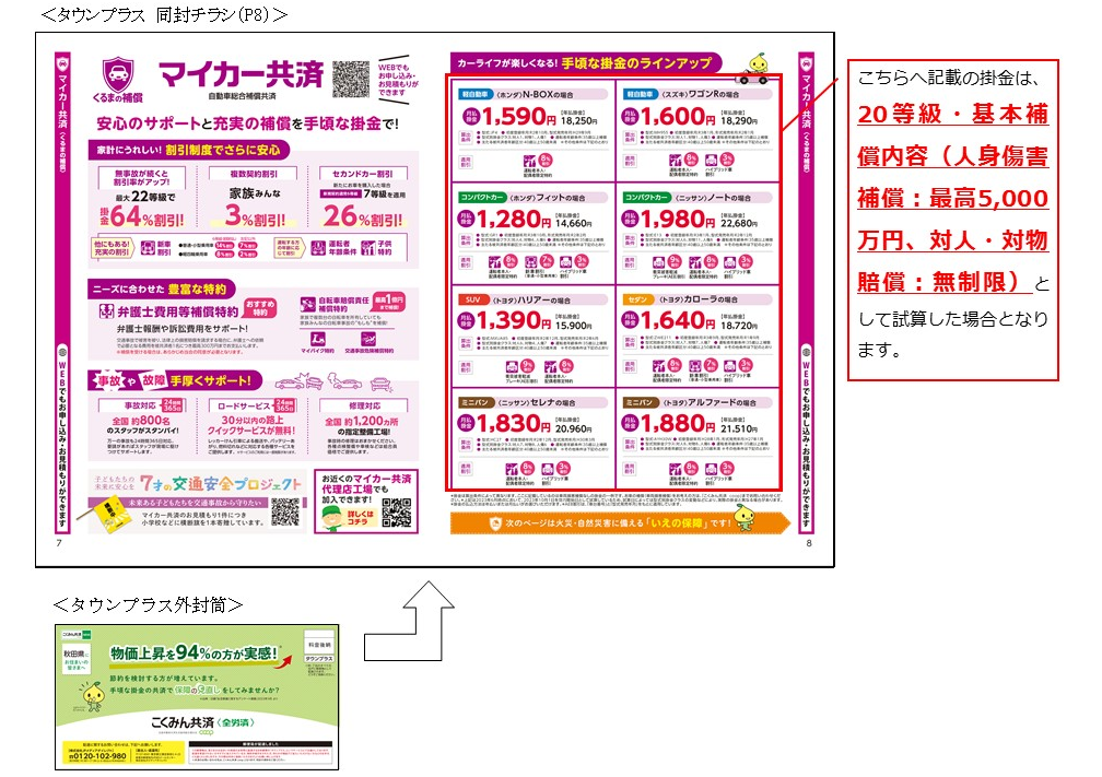 タウンプラス同封チラシ(P8)マイカー共済「手頃な掛金のラインアップ」枠内
