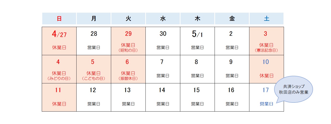 秋田県内共済ショップ窓口の ゴールデンウィーク期間中の営業に関しまして、 以下のとおりご案内いたします。