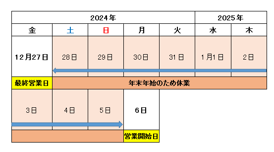 2024年12月28日(土)~2025年1月5日(日)まで休業とさせていただきます。