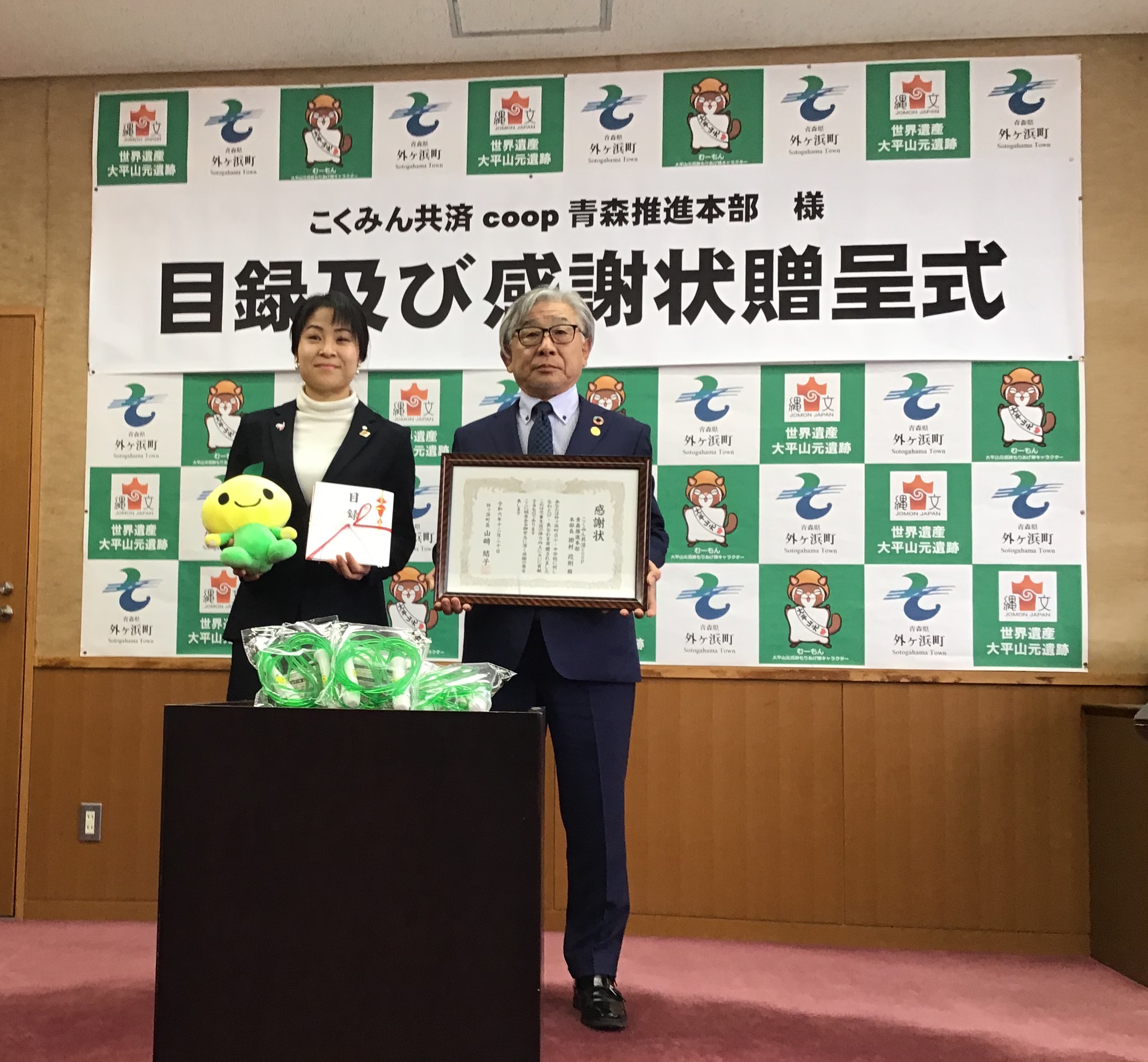 (掛村本部長よりなわとび・長なわをお渡しし、山﨑外ヶ浜町長より感謝状をいただきました。)