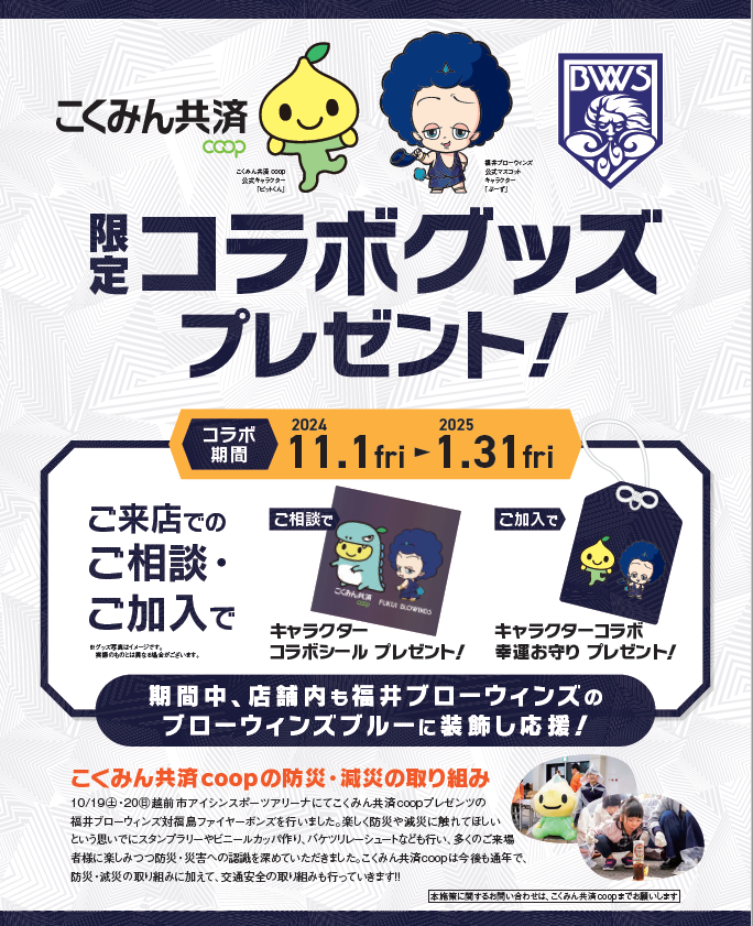 現在、共済ショップ福井店と共済ショップ敦賀店におきまして、「福井ブローウィンズ応援キャンペーン」を実施中です!