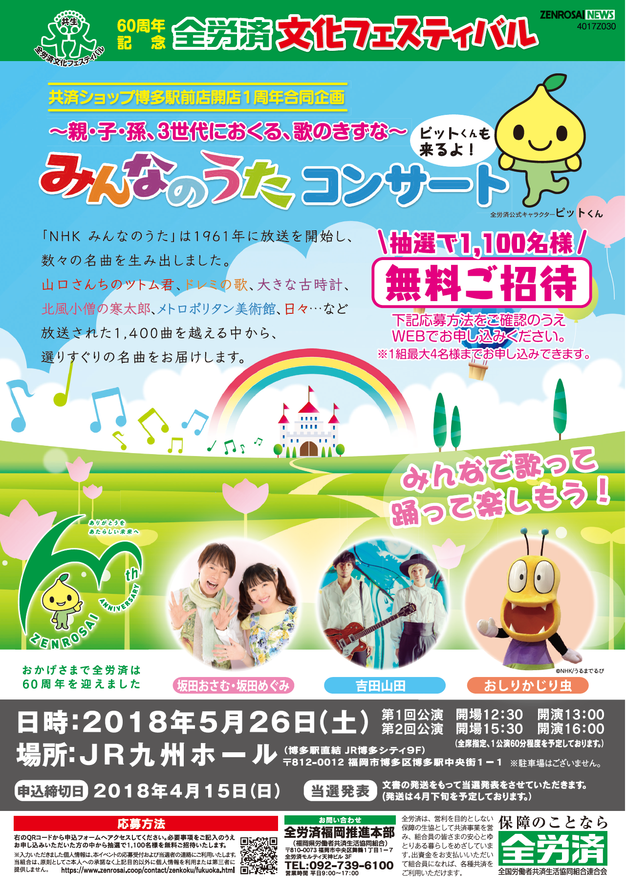 全労済福岡推進本部では、創立60周年を記念し、全労済文化フェスティバル「みんなのうた コンサート」を開催いたします。皆さまふるってご応募ください!