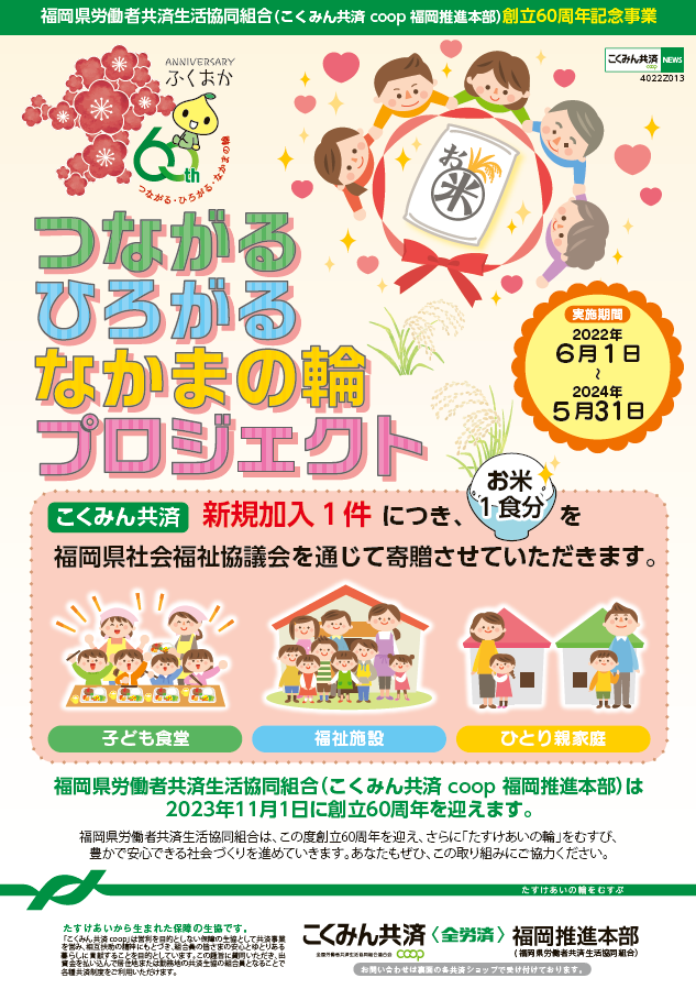 こくみん共済 coop 福岡推進本部では、福岡県労働者共済生活協同組合創立60周年を記念し、2022年6月1日~2024年5月31日の間、「つながる ひろがる なかまの輪プロジェクト」を実施しています。
