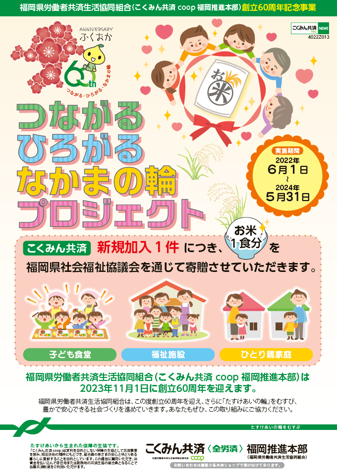 こくみん共済 coop 福岡推進本部は、福岡県労働者共済生活協同組合創立60周年を記念し2022年6月1日~2024年5月31日の間、「つながる ひろがる なかまの輪プロジェクト」を実施しています。
