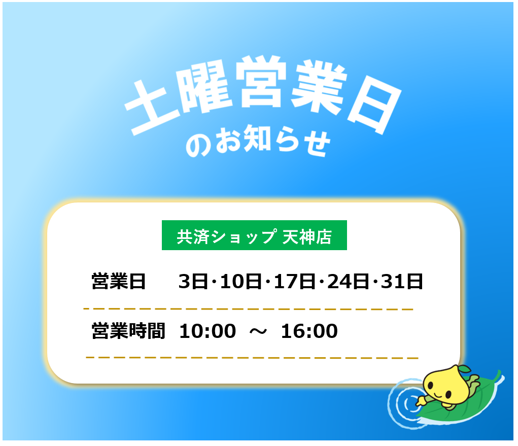 共済ショップ天神店では、平日だけでなく毎週土曜日も元気に営業しております。