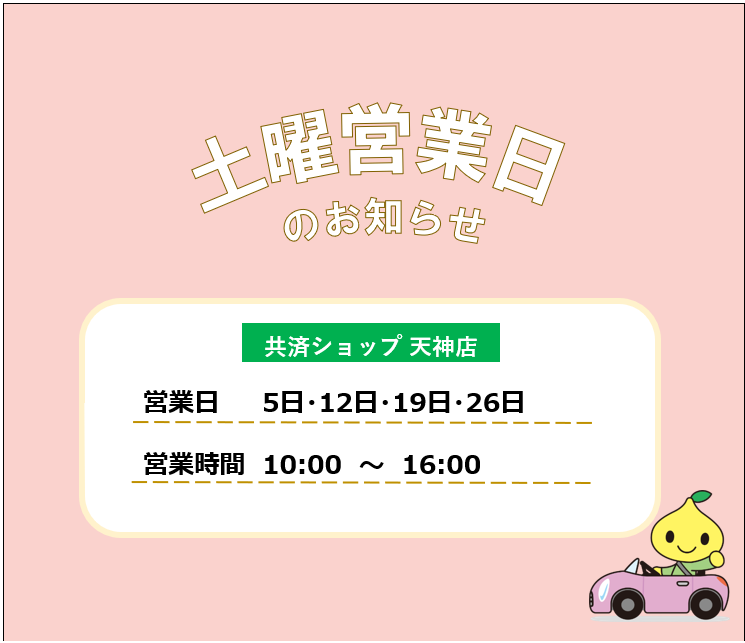 共済ショップ天神店では、平日だけでなく毎週土曜日も元気に営業しております。