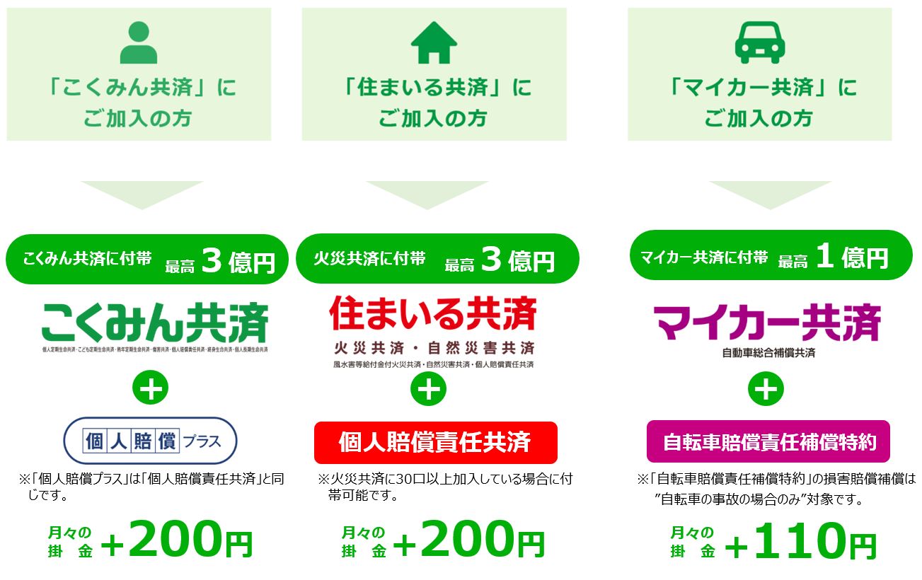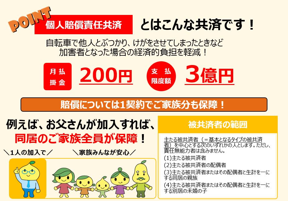 「個人賠償責任共済」は月200円で幅広い賠償事故をカバーすることが可能です。